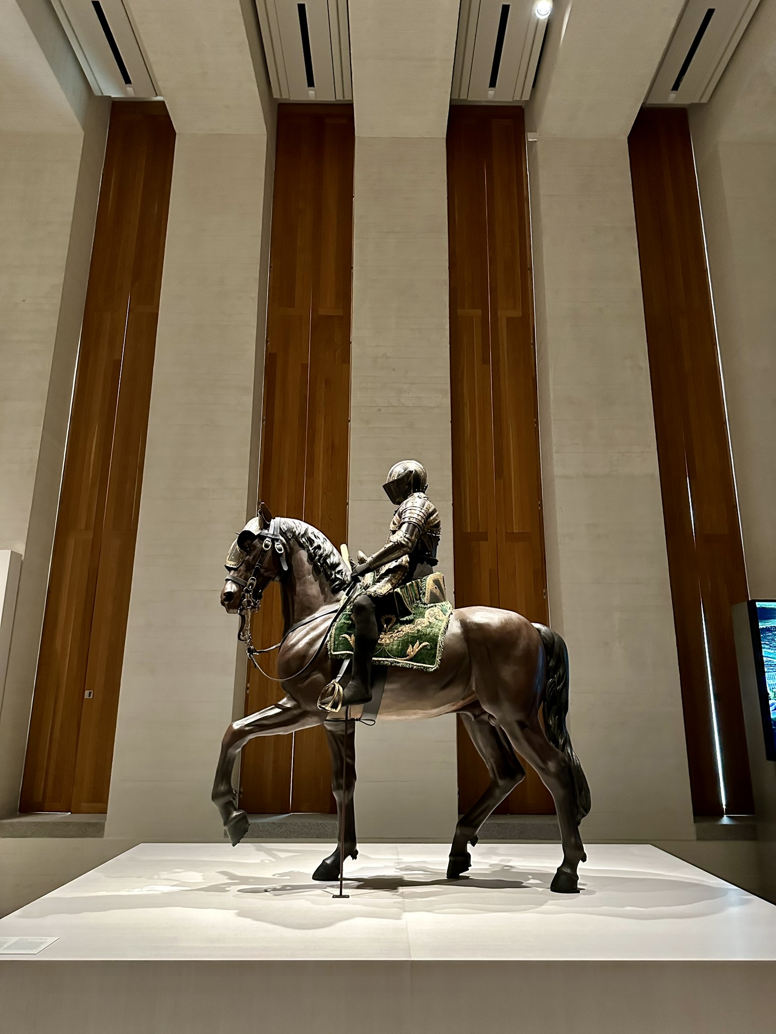 The collection highlights the tournament pieces made for Charles V and Philip II by leading armourers of Milan and Augsburg. AMong the most remarkable works are full armour and weapons that Emperor Charles V used in the Battle of Muhlberg, and which was portrayed by Titan in his famous equestrian portrait housed at the Museo del Prado. Unfortunately, parts of the cllection were lost during the Peninsular War and during the Spanish Civil War.