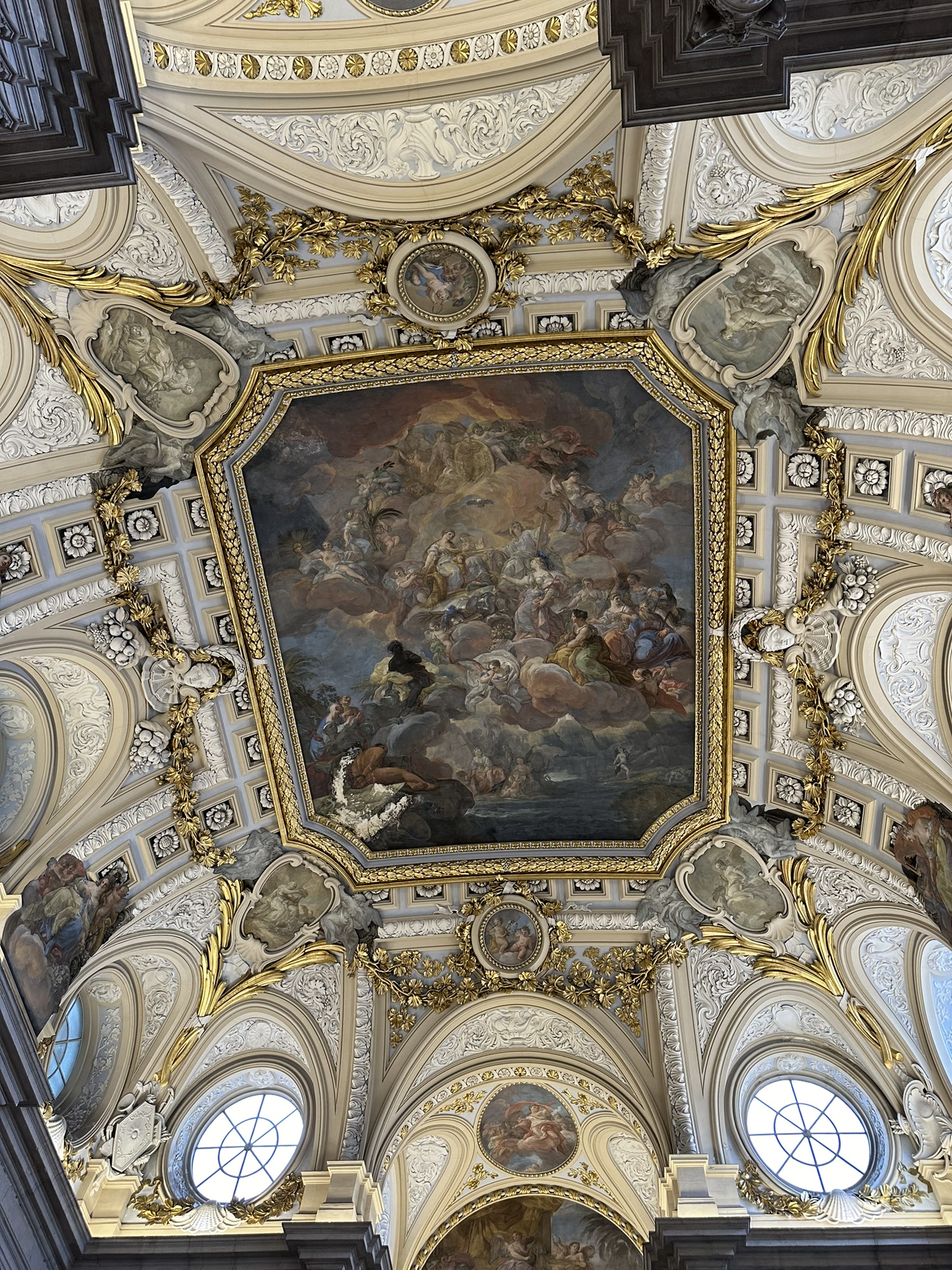 Regarding the exterior of the palace, the main facade consists of a two story rusticated stone base, from which rise ionic columns on Tuscan pilasters framing the windows of the three main floors. The upper story is hidden behind a comice which encircles the building and is capped with a large balustrade. This was adorned with a series of statues of saints and kings, but these were relocated elsewhere under the reign of Charles III to give the building a more classic appearance.