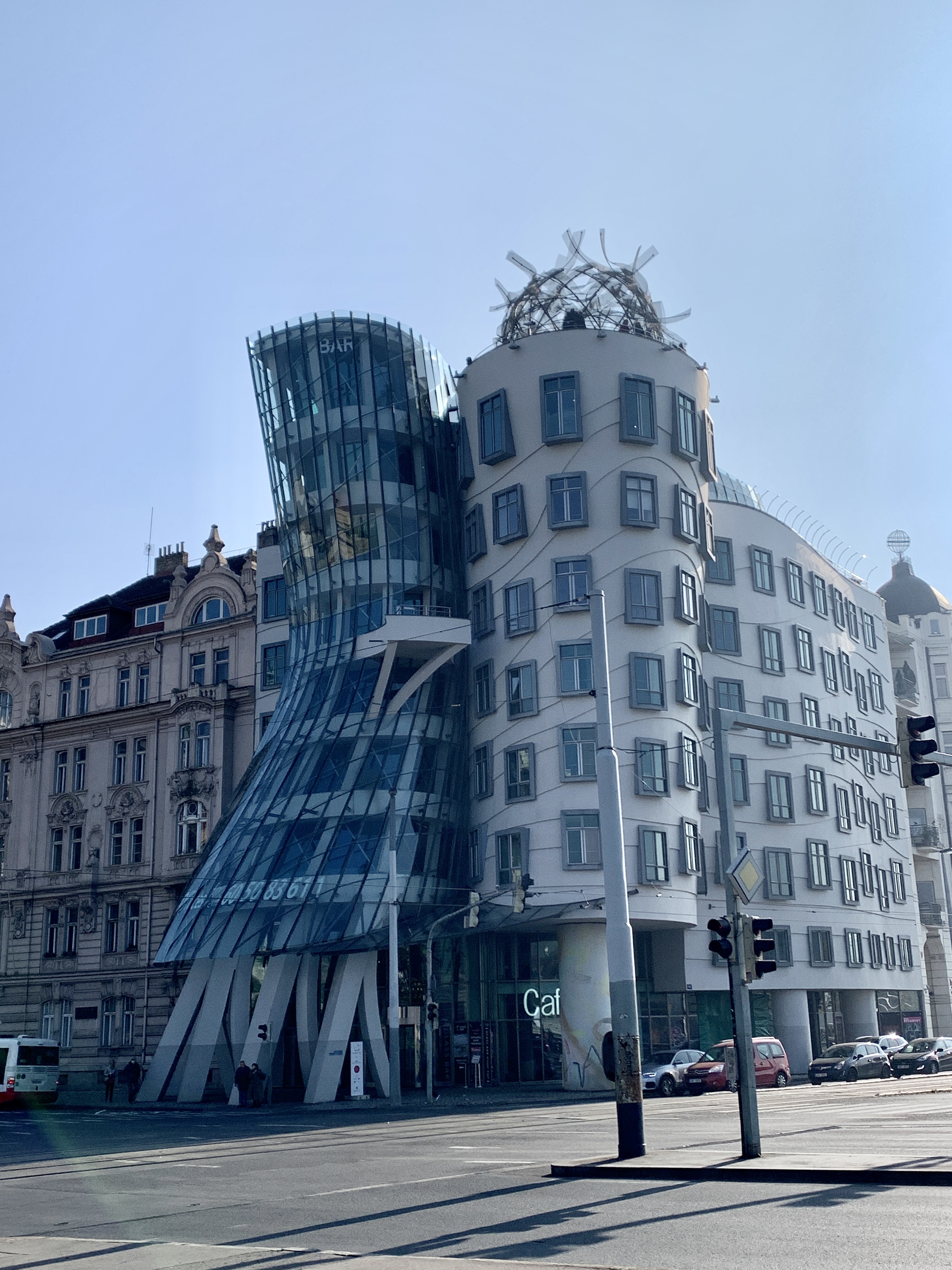 The bike tour took us to see one of my favorite buildings: the dancing house. This pillar of modern architecture in Prague “danced” onto the Rašínovo Embankment in 1996. The project comes from the drawing board of world-renowned architects Vlado Milunić and Frank O. Gehry. Its concept was inspired by the dance skills of the famous film couple — the stone tower symbolizes Fred Astaire and the glass tower, his partner Ginger Rogers. At the top of the building is a gallery and a restaurant with a terrace offering a 360° view of Prague.
